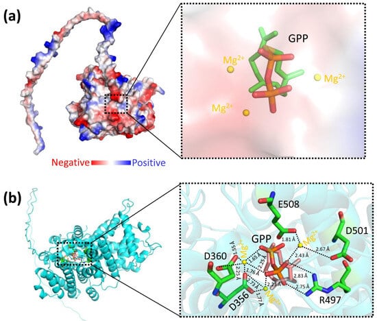 The structural prediction of LaBPPS using AlphaFold2 [35,36,49] demonstrated high reliability (Figure 2; Table 3). The structural model included both the terpene synthase and terpene cyclase domains (Figure 1 and Figure S1). Based on this model, molecular docking was performed using AutoDock software, AutoDock 4.2.6 (La Jolla, CA 92037, USA) to generate a protein–substrate complex (Figure 4). The binding energy, which served as an indicator of docking success, was calculated to be −5.79 kcal/mol, significantly exceeding the threshold of −1.2 kcal/mol, thereby confirming the validity of the docking results. In the predicted protein–substrate complex, the substrate geranyl diphosphate (GPP) was positioned securely within the binding pocket, with electrostatic interactions involving magnesium ions (Mg2+), the phosphate group of GPP, and the side chains of aspartic acid and glutamic acid facilitating the binding (Figure 4).