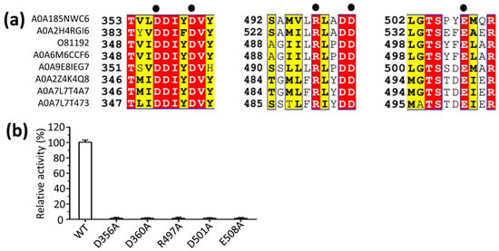 Enzymatic characterization of LaBPPS to assess the bornyl diphosphate synthase activity. (a) Sequence alignment of conserved residues from various species. A0A185NWC6, Lavandula angustifolia subsp. angustifolia; A0A2H4RGI6, Phyla dulcis (Aztec sweet herb, Lippia dulcis); O81192, Salvia officinalis (Sage); A0A6M6CCF6, Salvia officinalis (Sage); A0A9E8IEG7, Artemisia annua (Sweet wormwood); A0A2Z4K4Q8, Wurfbainia villosa; A0A7L7T4A7, Wurfbainia villosa; A0A7L7T473, Wurfbainia longiligularis. (b) The activities of wild-type (WT) LaBPPS and specific mutants were quantified. Mutants D356A, D360A, R497A, D501A, or E508A exhibited a reduction in the activity ranging from 50- to 100-fold. The activity of WT LaBPPS was set to 100%.