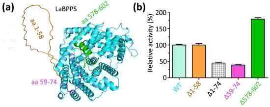 N- and C-terminus regulated the activity of LaBPPS. (a) The regions spanning residues 1–58, 59–74, and 578–602 are colored in orange, magenta, and green, respectively. (b) Deletion of region 1–58 (∆1–58) did not affect the activity, which remained identical to that of the wild-type (WT) protein. In contrast, deletions of region 1–74 or 59–74 (∆1–74 or ∆59–74) resulted in a significant reduction in the activity compared to the WT protein. However, deletion of 578–602 (∆578–602) led to a substantial increase in the activity. The activity of WT LaBPPS was set to 100%.