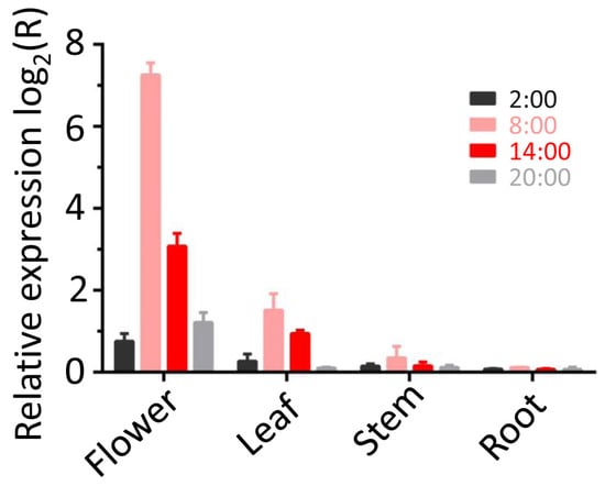LaBPPS gene expression profiles in different tissues (flower, leaf, stem, and root) during a 24 h day/night cycle. LaBPPS gene expression was significantly higher in flower compared to leaf, stem, and root, peaking at 8:00. The relative expression was assessed by RT-qPCR using beta-actin as a reference gene. The expression ratios are presented as log2 values, where a ratio greater than zero indicates an up-regulation.