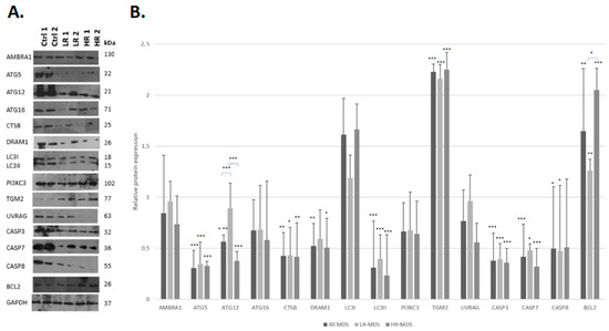 Figure 1. Lower expression levels of proteins implicated in the processes of autophagy and apoptosis in MDS patients compared to those in healthy donors. (A) Western blot experiments in representative samples from the groups of healthy donors (Ctrl1, Ctrl2) and MDS patients of different classifications (HR-MDS: HR1, HR2; LR-MDS: LR1, LR2). The intensity of the bands was quantified using the ImageJ 1.x software, while the expression ratio of each protein was estimated relative to that for the GAPDH protein. (B) Relative expression levels in the group of all MDS patients as well as in each of the MDS risk groups compared to those in the healthy controls. The statistical examination was performed using a one-way ANOVA and Tukey’s post hoc test. Asterisks represent statistically significant differences; one asterisk (*) corresponds to p < 0.05, two asterisks (**) correspond to p < 0.02, and three asterisks (***) correspond to p< 0.001. Error bars correspond to the standard deviation (SD).