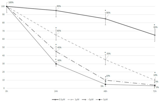 Figure 2. Treatment with azacitidine can induce strong cell apoptosis in MDS-L cells even after 24 h of culture. The graph depicts the cell viability curves for MDS-L cells treated with different concentrations of azacitidine (0.5 μΜ, 1 μΜ, 3 μΜ, or 5 μM) after 24, 48, and 72 h. Higher concentrations of azacitidine demonstrated an enhanced cytotoxic effect on the cells, with the degree of cytotoxicity progressively increasing over time, independent of the concentration. Asterisks represent statistically significant differences corresponding to p < 0.05. Error bars correspond to the standard errors (SEs).