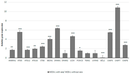 Figure 3. Treatment of MDS-L cells with a low concentration of azacitidine may lead to the restoration of autophagy and apoptosis. The expression patterns for a selected panel of 16 genes related to the processes of autophagy and apoptosis in MDS-L cells. Bars represent the relative gene expression levels in the MDS-L cells after treatment with azacitidine compared to those under the baseline status (i.e., without azacitidine treatment). Azacitidine treatment led to upregulation of all of the genes, besides downregulating the anti-autophagic and anti-apoptotic BCL2 gene. The HPRT1 gene was used as a reference. Asterisks represent statistically significant differences; one asterisk (*) corresponds to p < 0.05, two asterisks (**) correspond to p < 0.02, and three asterisks (***) correspond to p< 0.001. Error bars correspond to the standard errors (SEs).