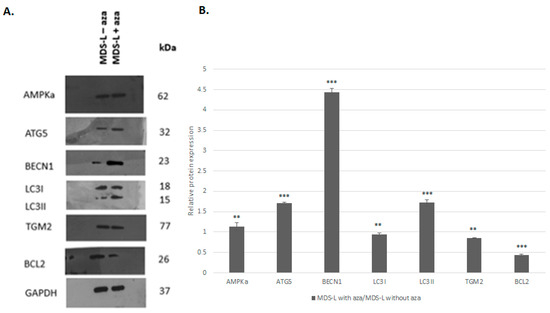 Figure 4. Azacitidine treatment can promote the activation of autophagy by upregulating promoting proteins and downregulating inhibitory proteins. (A) The immunoblot analysis of the expression of a series of proteins implicated in the processes of autophagy and apoptosis in MDS-L cells with and without treatment with azacitidine (MDS-L with aza and MDS-L without aza, respectively). Overall, azacitidine treatment was associated with higher expression levels of the AMPKA, ATG5, BECN1, and LC3II proteins, as well as lower expression levels of BCL2. (B) A bar graph depicting the relative expression levels of all proteins in the treated MDS-L cells compared to those in the baseline (untreated) MDS-L cells. Asterisks represent statistically significant differences; one asterisk (*) corresponds to p < 0.05, two asterisks (**) correspond to p < 0.02, and three asterisks (***) correspond to p < 0.001. Error bars correspond to standard errors (SEs).