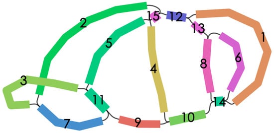 The graph model of the P. arguta mt genome. Chromosome 1 contains contigs 2, 3, 5, 7, 9, 11, and 15, and chromosome 2 contains contigs 1, 4, 6, 8, 10, 12, 13, 14, and 15.