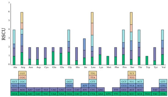 2.3. Relative Synonymous Codon Usage (RSCU) Analysis