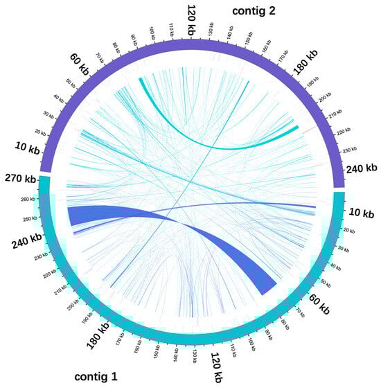 Comparative genomic analysis was performed using BLAST alignment in TBtools v2.003 to investigate potential sequence transfer between the chloroplast and mt genomes. For P. arguta, the mt genome was compared against its chloroplast counterpart with stringent parameters (identity ≥ 70%, e-value ≤ 1 × 10−5, alignment length ≥ 30 bp) [20]. The identified homologous sequences, indicative of possible inter-organellar DNA transfer events, were visualized using the Circos package within TBtools.