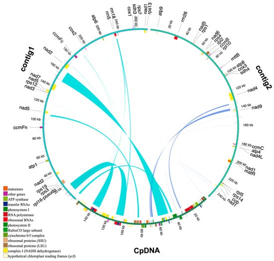 The mt genome of P. arguta was sequenced, assembled, and annotated. A total of 10,396,477,834 pieces of raw data and 591,417 bp of clean data were obtained using the PacBio Sequel II platform. The subreads were N50 and the mean reads were 17,594 bp and 17,578 bp, respectively (Table S1). Upon addressing the repeat regions, a complex assembly graph of the mt genome was established (Figure 1). Apparently, the mt genome of P. arguta adopts a unique conformation with three pairs of repeats. Next, we solved these repeats by artificially simulating possible paths and making judgments based on the mapping results of long reads (Figure S1). So, we obtained a total of 15 contigs by merging redundant nodes and a complex multibranched conformation. Despite efforts to reconstruct mtDNA as a closed-loop or a single linear molecule via standard methods, branches persistently prevented its simplification into a unified form. Hence, we proceeded the mtDNA into two linear molecules in the order of contig 9-contig11-contig5-contig15-contig2-contig7-contig11-contig3 and contig1-contig14-contig10-contig4-contig15-contig12-contig13-contig8-contig8-contig14-contig6, respectively (Figure S2, Table S2). Of course, it needs to be explained that the treatment here is not the only form due to the complexity and dynamics of plant mtDNA configuration, and the treatment here was selected since it was convenient for subsequent analysis. Hence, according to the treatment, the lengths of contig 1 and 2 were 272,565 bp and 249,405 bp with GC contents of 45.66% and 45.58%, respectively (Figure 2, Table S2). The mt genome assembly exhibits high quality, a gap-free structure, and a coverage depth of 197.5× (Figure S3).