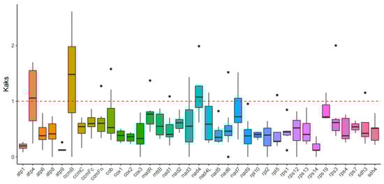 The non-synonymous-to-synonymous substitution ratio (Ka/Ks) is important in ge- netics for assessing the magnitude and direction of natural selection acting on homologous genes among divergent species. We conducted comparative Ka/Ks analysis of 37 mitochondrial PCGs using P. arguta as the reference species to assess evolutionary selection pressures (Figure 6). Most PCGs exhibited Ka/Ks ratios < 1, indicating the stability of the protein function of these genes during evolution. However, the Ka/Ks values of the atp4 (1.05), ccmB (1.39), and nad4 (1.15) were higher than 1, which means that these PCGs were subject to positive selection. The nucleotide diversity (Pi) values of 37 PCGs were accounted for and varied from 0.01782 to 0.10852, with an average of 0.04719. The Pi value of gene atp9 was largest among these regions, being 0.10852 and 0.01782 in gene rps14, 0.02399 in gene nad7, 0.02442 in gene nad4L, and 0.02487 in gene nad9. The lower Pi values revealed that the mt genome sequences of P. arguta were highly conserved (Figure S4, Table S8).