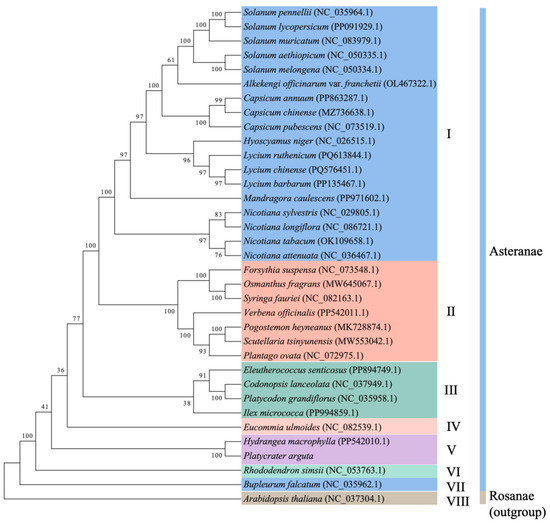 Maximum-likelihood phylogenetic tree based on 37 conserved PCGs among 35 species. A. thaliana was used as the outgroup. The 35 species were divided into eight groups (Group I–VIII). NCBI accession numbers are listed behind the scientific name.
