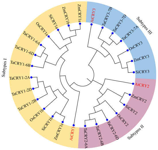 Whole-genome sequencing data of the cultivars Chinese Spring (Triticum aestivum L.), rice (Oryza sativa Japonica), maize (Zea mays L.), and foxtail millet (Setaria italica L.), encompassing reference genome sequences, protein sequences, and GFF3 annotation files, were sourced from the Ensembl Plants database (https://plants.ensembl.org/index.html, accessed on 20 May 2024). Protein sequences corresponding to three AtCRY members in Arabidopsis thaliana (Supplementary Table S1) were retrieved from the National Center for Biotechnology Information (NCBI) database (https://www.ncbi.nlm.nih.gov/, accessed on 8 January 2025). The sequences of AtCRY members served as query templates in a BLASTP search conducted via TBtools-II (version 2.313) software [33] to identify potential TaCRY, OsCRY, ZmCRY, and SiCRY members. Hidden Markov Models (HMMs) for the conserved domains PF00875, PF03441, and PF12546 of CRY members were downloaded from the Pfam database (http://pfam.xfam.org/, accessed on 15 January 2025) and utilized with the “simple HMM search” tool in TBtools-II (version 2.313) software [34] to screen and compare whole-genome protein sequences against these HMM profiles. Validation of CRY candidates was further performed using the NCBI-CDD tool (https://www.ncbi.nlm.nih.gov/Structure/bwrpsb/bwrpsb.cgi, accessed on 18 January 2025) [35,36,37]. By integrating results from BLASTP, HMMER, and NCBI-CDD analyses, TaCRY members were definitively confirmed using the Triticeae-GeneTribe platform (http://wheat.cau.edu.cn/TGT/, accessed on 25 January 2025) with functional annotation support [38].