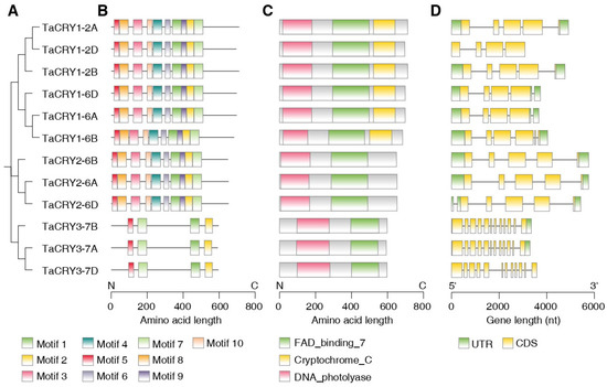 Phylogenetic relationship, conserved motif, conserved domain, and gene structure analysis of TaCRY members. (A) Phylogenetic tree. (B) Conserved motifs identified by MEME, with different colored boxes representing motifs containing specific amino acid sequences. (C) Domain architecture identified by NCBI-CDD, with different colored boxes representing conserved domains. (D) Exon/intron structures of TaCRY members.