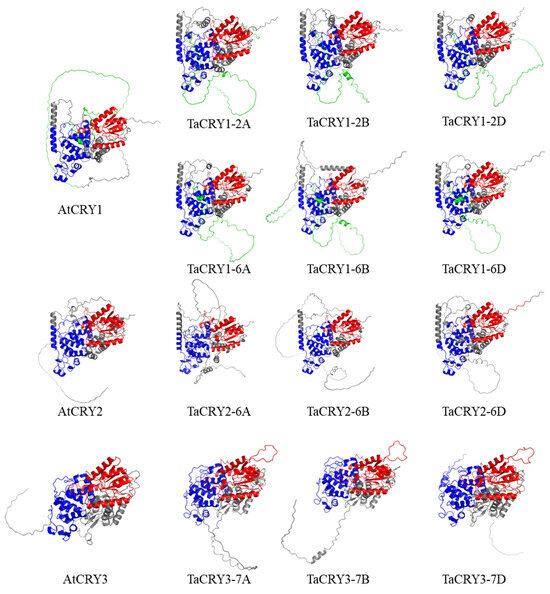 To elucidate the structural features of the CRY proteins, we employed the AI-driven AlphaFold 3 platform to predict the tertiary structures of Arabidopsis (AtCRYs) and wheat (TaCRYs) orthologs. Structural alignment revealed conserved folding patterns among proteins within the same CRY subfamily: AtCRY1 exhibited high structural homology with TaCRY1-2A, TaCRY1-2B, TaCRY1-2D, TaCRY1-6A, TaCRY1-6B, and TaCRY1-6D, while AtCRY2 showed structural conservation with TaCRY2-6A, TaCRY2-6B, and TaCRY2-6D. Notably, AtCRY3 demonstrated close structural similarity to TaCRY3-7A, TaCRY3-7B, and TaCRY3-7D but diverged significantly from the CRY1 and CRY2 subfamilies (Figure 3). This pattern indicates that cross-species orthologs within the same CRY subfamily maintain conserved tertiary structures, whereas paralogs from different subfamilies exhibit marked structural divergence.