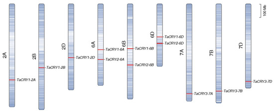 To elucidate the chromosomal distribution of TaCRY members, we conducted a comprehensive chromosomal localization analysis in wheat. This mapping revealed an uneven distribution of the 12 TaCRY members across chromosomes 2 (2A/2B/2D), 6 (6A/6B/6D), and 7 (7A/7B/7D) (Figure 4). Chromosomes 2A, 2B, 2D, 7A, 7B, and 7D each harbor one TaCRY gene. Notably, chromosomes 6A, 6B, and 6D each harbor two TaCRY genes, accounting for half of all characterized TaCRY members. This concentration suggests potential locus-specific regulatory or functional significance within this genomic region. The collinearity relationship analysis indicates that the expansion of the TaCRY gene family in wheat was primarily driven by whole-genome duplication events (Figure 5). For instance, the paralogous groups TaCRY1-2A, TaCRY1-2B, and TaCRY1-2D, as well as TaCRY3-7A, TaCRY3-7B, and TaCRY3-7D, demonstrate this duplication pattern. Additionally, the TaCRY1-6A, TaCRY1-6B, and TaCRY1-6D and TaCRY2-6A, TaCRY2-6B, and TaCRY2-6D subfamilies exhibit close evolutionary associations with the triplicated subgenomes of hexaploid wheat (Figure 5). These observations suggest that the ancestral TaCRY gene repertoire in progenitor wheat species (e.g., Triticum urartu) likely comprised only four foundational members, a configuration mirroring the TaCRY gene counts observed in other monocotyledonous species such as rice and foxtail millet. Collectively, this syntenic analysis provides preliminary insights into the evolutionary origins and conserved expansion mechanisms of the TaCRY gene family across grass species.