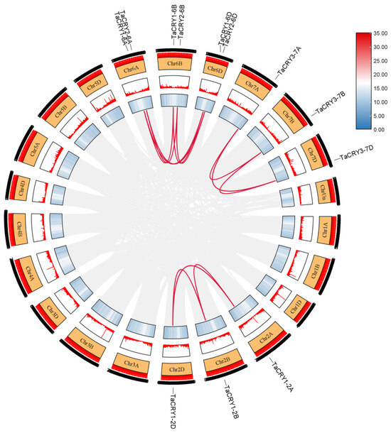 Collinearity analysis of TaCRY members. The red lines represent gene pairs with collinearity relationships, the numbers in the boxes represent chromosomes, and the red and light blue boxes represent gene density.