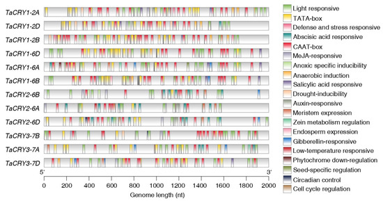 Cis-acting elements analysis of TaCRY members. Diverse colored boxes representing distinct cis-acting elements. Names of cis-acting elements are shown on the right.