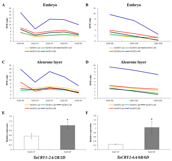 The expression of TaCRYs in embryo (A,B) and aleurone layer (C,D). Transcripts per million (TPM) value was used to normalize RNA-seq data. The expression of TaCRY1-2A/2B/2D (E) and TaCRY2-6A/6B/6D (F) in seeds; * represents p-value ≤ 0.05. The Y on the horizontal axis in Figures (A,C,E,F) represents year. The horizontal axis D in Figures (B,D) represents day.