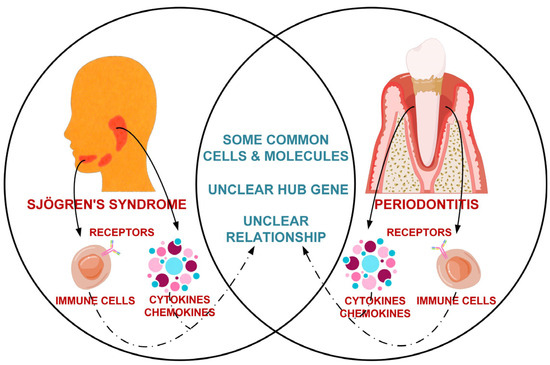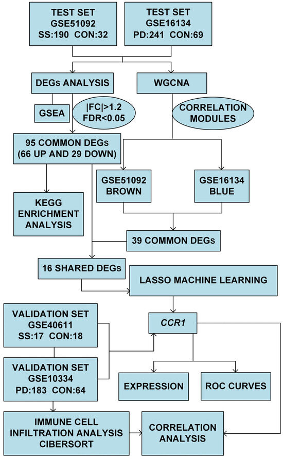 Pathophysiologically, SS and PD are intricately linked, with specific pathways potentially mediated by complex networks of cells (e.g., γδT cells) and molecules (e.g., CXCR4) [16,17,18]. However, a clear association between SS and PD has not yet been vividly demonstrated (Figure 1). This study seeks to enhance the comprehension of the co-occurrence mechanisms of SS and PD by investigating their common transcriptional landscape. Through multi-source dataset integration and cross-disease target identification, this data-driven approach replaces hypothesis-driven research, furnishing a foundation for comorbidity prediction modeling and bioinformatics evidence for comorbidity subtype analysis.