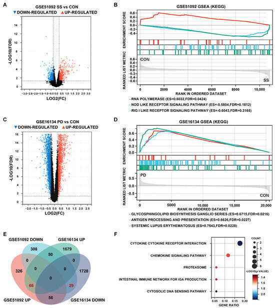 Identification of differentially expressed genes (DEGs) and gene set enrichment analysis (GSEA) pathways of SS and PD. (A,C) Volcano maps of SS and PD test sets. (B,D) KEGG enrichment analysis of SS and PD test sets using the GSEA method. (E) Intersection of DEGs in SS and PD test sets. (F) Kyoto encyclopedia of genes and genomes (KEGG) enrichment analysis of common DEGs.