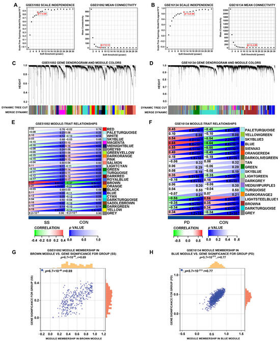 Weighted gene co-expression network analysis (WGCNA) of the significant modules in SS and PD. (A,B) The selection of soft thresholds in SS (GSE51092) and PD (GSE16134). (C,D) Gene cluster dendrograms for SS and PD by the dynamic tree cut algorithm. (E,F) Heatmaps of SS and PD module-clinical trait associations. (G,H) The relationships between module membership and gene significance in the brown module of SS and the blue module of PD.