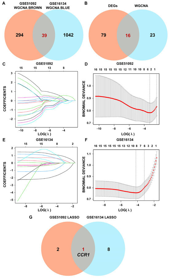 Upon intersecting the brown module in the SS test set with the blue module in the PD test set after WGCNA, 39 genes were obtained (Figure 5A). After intersecting DEGs analysis results with those of WGCNA in the SS and PD test sets, 16 genes were derived as the input data for Lasso regression (Figure 5B). To gain deeper insights into the characteristic genes of both SS and PD, LASSO regression analysis was performed using the matrices of 16 intersecting DEGs (Figure 5C–F). Through the screening process, three intersecting DEGs were detected in SS and nine in PD. Notably, CCR1 was found to be a candidate pathogenic biomarker between the two conditions (Figure 5G).