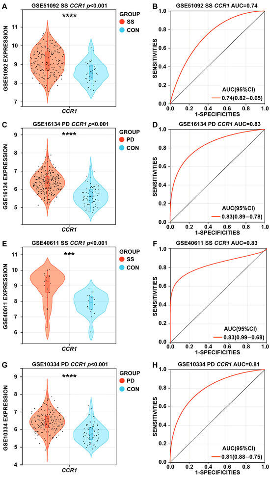 Expression levels and receiver operating characteristic (ROC) curves of CCR1 in SS and PD. (A,E) The expression values of CCR1 in the SS test and validation set. (B,F) The ROC curve of CCR1 in the SS test and validation set. (C,G) The expression values of CCR1 in the PD test and validation set. (D,H) The ROC curve of CCR1 in the PD test and validation set. *** p < 0.001; **** p < 0.0001.