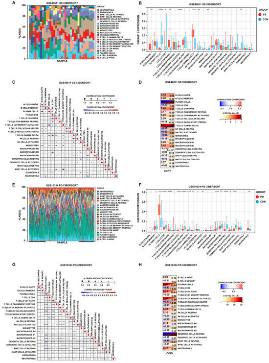 Immune cell infiltration in SS and PD. (A,E) Stacked bar charts depicting the proportions of immune cell infiltration in the tissues of SS and PD patients. (B,F) Box plots comparing the proportions of immune cells between the SS and PD groups and the control group. (C,G) Heatmaps illustrating the correlations among different immune cells in the tissues of SS and PD patients. The asterisks within the squares denote the correlation coefficients between the respective immune cells. (D,H) Correlations between CCR1 and immune cells in SS and PD. * p < 0.05; ** p < 0.01; *** p < 0.001; **** p < 0.0001.