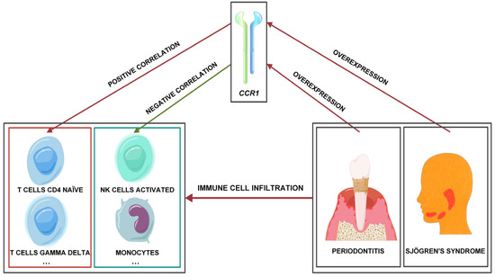CCR1 has been reported to be associated with periodontitis using multiple computational tools [34]. The lack of chemokine receptor CCR1+ diminishes inflammatory bone resorption throughout experimental periodontitis in mice. Inhibition of CCR1 and suppression of osteoclast differentiation can be observed in murine experimental periodontitis [35]. Inhibition of the CCR1 gene in macrophages of periodontitis may reduce the chemotaxis of local macrophages in the periodontal region, which may contribute to the alleviation of bone destruction caused by periodontitis [36]. Bioinformatics analysis has integrated three salivary gland datasets of SS and screened CCR1 as a hub gene. Immunohistochemical investigations have revealed that the expression of CCR1 protein in the labial glands of SS patients is elevated compared to non-SS patients [37]. CFL1 can modulate the expression levels of the downstream CCL5/CCR1 axis to augment the migration and proliferation of bone marrow-derived mesenchymal stem cells in SS murine models [38]. RNA sequencing revealed a set of autosomal differentially expressed genes with an interferon signature in the B cells of SS, notably including highly elevated CCR1, which has been verified [39]. CCR1 is implicated in various inflammatory illnesses and is linked to particular immune cells. The CCL2/CCR2 axis and CCL3 can recruit circulating monocytes to the inflamed synovium through CCR1 [40]. Eosinophil-derived hCCL15/23 and mCCL6 can engage with CCR1 to facilitate eosinophilic airway inflammation [41]. The ligands of CCR1 impede the degranulation and mediator release of mast cells activated by IgE/Ag, SCF, or HSP70 via the phosphorylation of Lck and the dephosphorylation of the phosphatase-1 containing the Src homology 2 domain [42]. CCR1 antagonists can impede cell infiltration, inflammation, and the Th1 cytokine response in human CCR1 transgenic mice [43].