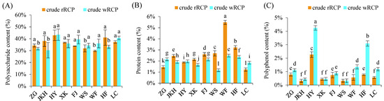 Composition of crude RCP. (A) Polysaccharide content of crude RCP; (B) protein content of crude RCP; (C) polyphenol content of crude RCP. Different letters (a–l) above bars indicate statistically significant differences at p < 0.05 level.