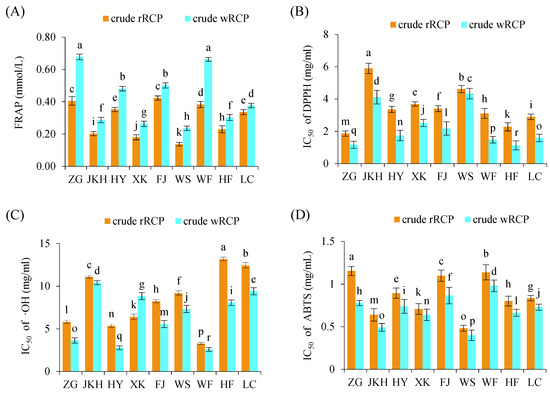 In vitro antioxidant activity of crude RCP. (A) Total antioxidant capacity (FRAP) of crude RCP; (B) IC50 value of DPPH radical scavenging activity; (C) IC50 value of ABTS radical scavenging activity. (D) IC50 value of hydroxyl radical (•OH) scavenging activity. Different letters (a–r) above the bars indicate statistically significant differences at p < 0.05.