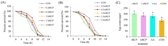 Effects of RCP on lifespan and reproduction in C. elegans. (A) Survival curves of C. elegans exposed to rRCP under heat stress; (B) survival curves of C. elegans exposed to wRCP under heat stress; (C) egg-laying performance of C. elegans treated with RCP. Different letters (a, b) above the bars indicate statistically significant differences at p < 0.05.