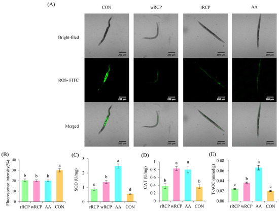 Thermal stress, a form of intrinsic cellular stress, can lead to significant ROS accumulation in cells. To investigate the effects of rRCP and wRCP on the antioxidant defense system in C. elegans, we measured the activities of antioxidant enzymes and total antioxidant capacity (T-AOC) in C. elegans treated with rRCP and wRCP. Compared to the CON group, rRCP, wRCP, and AA treatments significantly reduced the fluorescence intensity of ROS in C. elegans, with wRCP showing slightly stronger effects (Figure 4A,B). The fluorescence intensity results revealed that the ROS levels of the rRCP, wRCP, and AA groups decreased by 31.67%, 33.14%, and 33.37%, respectively.