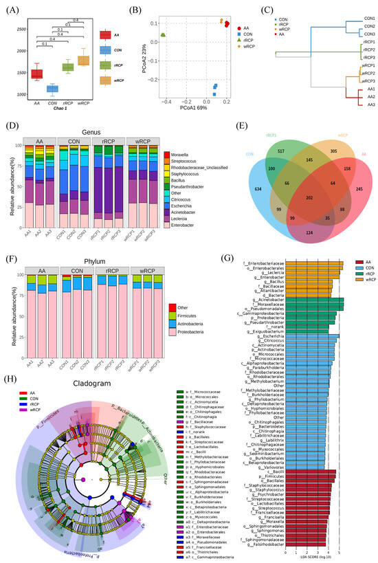 To further investigate the specific changes in microbial communities, we analyzed the taxonomic composition of each group’s samples at the phylum level. Proteobacteria dominated, with over 75% relative abundance, followed by Actinobacteria and Firmicutes. Compared with the CON group, the abundance of Actinobacteria decreased in the rRCP, wRCP, and AA groups. The abundance of Firmicutes increased in the AA and wRCP groups, while the abundance of Proteobacteria increased in the rRCP group (Figure 5F). At the genus level, Enterobacter, Leclercia, Acinetobacter, Escherichia, Citricoccus, Pseudarthrobacter, Bacillus, Staphylococcus, Rhodobacteraceae_Unclassified, Streptococcus, and Moraxella were identified as the 11 microbiota demonstrating relative abundances exceeding 1% (Figure 5D). Among these classified genus, the abundance of Escherichia was highest in the CON group, followed by Leclercia and Enterobacter. The AA and wRCP groups exhibited the highest relative abundances of Leclercia and Enterobacter, followed by Escherichia. In the rRCP group, Acinetobacter demonstrated the greatest abundance, with Escherichia and Leclercia ranking second and third, respectively. Compared with the CON group, the AA group exhibited reduced abundances of Acinetobacter, Escherichia, and Citricoccus, while Rhodobacteraceae (Unclassified) remained unchanged, and other bacterial genera showed increased abundance profiles. The rRCP group showed an increase in Acinetobacter; Pseudarthrobacter, and Bacillus were raised, while other bacterial genera decreased. The wRCP group exhibited a significant increase in the abundance of Enterobacter, Leclercia, Bacillus, and Streptococcus, while the abundance of Acinetobacter remained unchanged. All other bacterial genera demonstrated a marked reduction in their abundances. Compared with the CON group, the AA, wRCP, and rRCP groups showed reduced abundances of Escherichia and Citricoccus, along with an increased abundance of Bacillus.