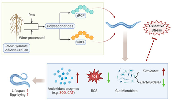 Previous studies have shown that oxidative stress is closely associated with the gut microbiota, and that gut microbial communities play a crucial role in the interactions between polysaccharides and the host. Polysaccharides may either be degraded into smaller absorbable molecules or modulate host health by reshaping gut microbiota composition [52,53,54,55]. In this study, rRCP and wRCP reduced the relative abundance of Bacteroidetes and Actinobacteria while increasing the Firmicutes in C. elegans. Notably, the changes in the wRCP group were similar to those in the AA group. Similar microbial shifts have been observed in experiments with polysaccharide-treated mice [56,57], human colitis patients [58,59], traumatic brain injury models [60], and patients with Alzheimer’s disease [61]. Numerous studies suggest that ecological dysbiosis is typically characterized by an elevated abundance of Bacteroidetes and Proteobacteria, coupled with a reduction in Firmicutes [62,63]. Additionally, studies have demonstrated that, with advancing age, the abundance of Bacteroidetes and Proteobacteria increases, while that of Firmicutes decreases [64]. These findings suggest that RCP may exert effects via gut microbiota modulation, specifically by increasing Firmicutes and decreasing Bacteroidetes during host–microbiota interactions, thereby extending the lifespan of nematodes (Figure 6).