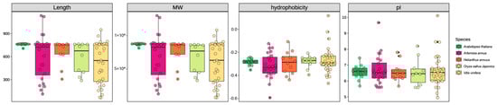 The protein sequences of OSC genes identified in Artemisia annua, Arabidopsis thaliana, Helianthus annuus, Oryza sativa Japonica, and Vitis vinifera were retrieved from genomic annotation data. Key physicochemical properties were calculated for each OSC protein sequence using the Peptides package (version 2.4.5) in R. The calculated properties included: protein length (number of amino acid residues), molecular weight (MW), hydrophobicity (quantified as the Grand Average of Hydropathy, GRAVY index), and isoelectric point (pI). The resulting data were statistically analyzed and visualized using ggplot2 v3.4.4.