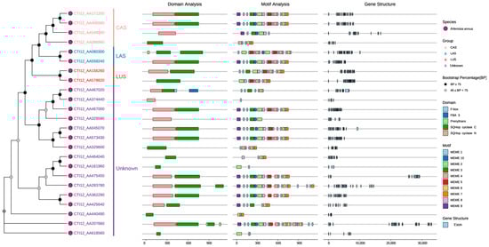 Phylogenetic analysis of 24 AaOSC genes resolved four functional clades: CAS (cycloartenol synthase), LAS (lanosterol synthase), LUS (lupeol synthase), and an evolutionarily divergent unknown clade, with most nodes showing strong bootstrap support (≥75%) and partial support (45–75%) for minor branches (Figure 2). Subsequent domain architecture analysis confirmed canonical OSC functions through conserved SQHop cyclase N-terminal and C-terminal domains across all members, though CTI12_AA467020 (unknown clade) uniquely encoded a C-terminal F-box domain, suggesting potential post-translational regulatory mechanisms distinct from typical OSCs. Furthermore, clade-specific motif organization revealed core signatures in the CAS clade despite significant variations in motif order/composition within clades (e.g., CTI12_AA425640 vs. CTI12_AA2077660). This variability was mirrored in gene structure complexity, where exon numbers ranged widely (12–26) and intron lengths exhibited pronounced divergence, particularly in CTI12_AA475450 and CTI12_AA207660, consistent with functional diversification across the gene family.