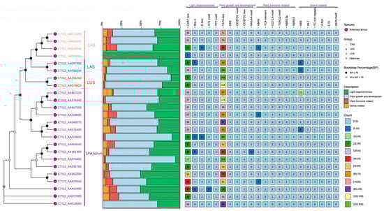 Cis-regulatory element analysis of AaOSC gene promoters. The phylogenetic tree on the left indicates the relationships between the 24 AaOSC genes analyzed. The stacked bar chart displays the relative proportion of CRE categories (light responsiveness, plant growth and development, plant hormone-related, and stress-related). The heatmap represents the number of each CRE type found in the promoter region of each gene. The color intensity in the heatmap corresponds to the number of elements as indicated in the legend.