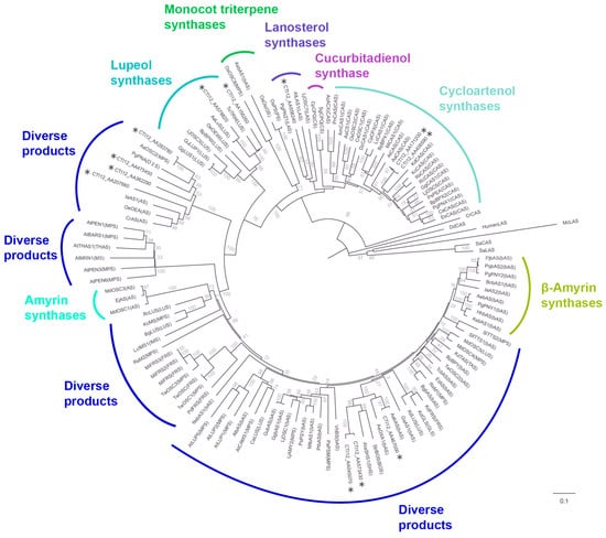 - Xue, Z.; Duan, L.; Liu, D.; Guo, J.; Ge, S.; Dicks, J.; ÓMáille, P.; Osbourn, A.; Qi, X. Divergent Evolution of Oxidosqualene Cyclases in Plants. New Phytol. 2011, 193, 1022–1038. [Google Scholar] [CrossRef]