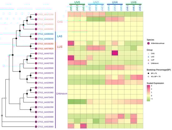 The expression patterns of AaOSC genes were analyzed under various UV irradiation treatments (0 h, 2 h, 4 h, and 6 h of UV exposure) using heatmap visualization (Figure 7, Table S2). A phylogenetic tree showing the relationships among the analyzed AaOSC genes is displayed alongside the heatmap. The heatmap reveals distinct expression patterns across the different AaOSC gene family members and UV treatments. Most of the genes show differences in gene expression between the different UV exposure levels. Genes belonging to the CAS and LAS subfamilies generally exhibited relatively low expression levels across all UV treatments compared to the other groups. Notably, CTI12_AA406590 exhibited relatively higher expression in the UV4 condition compared to other CAS family members. The expression of the LUS subfamily showed variation under different UV treatments. CTI12_AA156260 displayed relatively high expression in the UV0 condition, while CTI12_AA578820 appeared to be upregulated in the UV2 condition. Genes from the unknown subfamily showed distinct expression patterns. Notably, CTI12_AA467020 was upregulated in the UV4 conditions. Several genes within the unknown subfamily showed minimal changes in expression. However, CTI12_AA440490 expression notably increased in UV4.