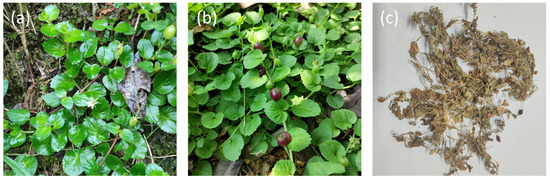 Representative images of Lobelia nummularia Lam. (a) Plants growing in the wild habitat showing green fruits and purple-white flowers; (b) field plants with partially ripened fruits, exhibiting a red-purple hue; (c) the dried whole-plant sample of Lobelia nummularia used in this study.