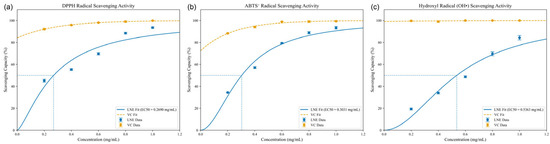 Reactive oxygen species (ROS) are involved in many aspects of health and disease. There is a delicate balance between the oxidative stress and antioxidant mechanisms within cells to ensure that physiological functions are maintained. Any disruption of this balance may lead to pathological consequences. Antioxidant activity analysis may provide the direction and basis for further biological screening tests in the study. Here, we evaluated the antioxidant activity of LNE through experiments on the scavenging abilities of DPPH radicals, ABTS cation radicals, and hydroxyl radicals. The results are shown in Figure 1a–c. The antioxidant activity of LNE at all measured concentrations was dose-dependent, but to varying degrees. At the same concentration, the scavenging activities of DPPH, ABTS, and OH radicals of LNE were lower than those of the positive control (vitamin C). The IC50 values of the scavenging activities of DPPH, ABTS, and OH radicals of LNE were 0.27, 0.30, and 0.54 mg/mL, respectively (Figure 2). This indicates that LNE contains a large amount of antioxidants and has potential application potential.