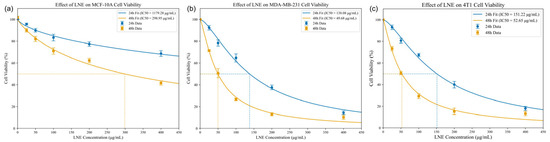 The cytotoxic effects of LNE were evaluated on human (MDA-MB-231) and murine (4T1) TNBC cells, as well as on non-cancerous human breast epithelial cells (MCF-10A), using a CCK-8 assay. As shown in Figure 3, LNE inhibited the viability of all cell lines in a dose- and time-dependent manner. Notably, LNE was significantly more potent against the cancer cell lines. The 48 h IC50 values for MDA-MB-231 and 4T1 cells were 46.08 µg/mL and 52.65 µg/mL, respectively, indicating a comparably high sensitivity to LNE. In contrast, the non-cancerous MCF-10A cells were much less sensitive, with a 48 h IC50 of 298.95 µg/mL. This demonstrates LNE’s potent and selective cytotoxic activity against TNBC cells.