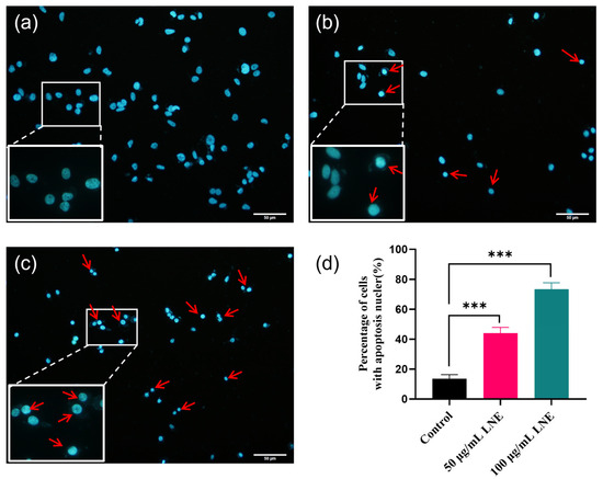 LNE-induced apoptosis in MDA-MB-231 cells visualized by Hoechst 33258 staining. (a) Control group showing normal nuclear morphology with uniform chromatin distribution; (b) cells treated with 50 μg/mL LNE for 48 h, exhibiting early apoptotic features such as chromatin condensation (indicated by arrows); (c) cells treated with 100 μg/mL LNE for 48 h, showing prominent nuclear fragmentation and apoptotic bodies (indicated by arrows); (d) quantification of apoptotic cells based on Hoechst-positive nuclei. Data are presented as the mean ± SD (n = 3). *** p < 0.01 vs. control group.