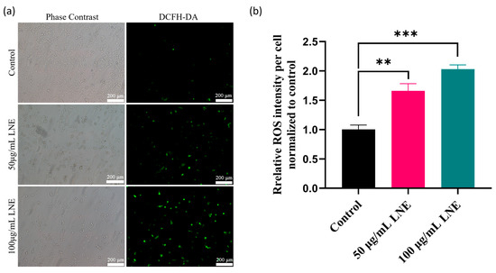 LNE induces intracellular reactive oxygen species (ROS) accumulation in MDA-MB-231 breast cancer cells. (a) Fluorescence microscopy images of DCFH-DA-stained MDA-MB-231 cells after treatment with LNE (50 and 100 μg/mL for 48 h), showing increased green fluorescence intensity indicative of ROS production; (b) quantitative analysis of mean fluorescence intensity of DCF signal. LNE treatment significantly elevated ROS levels in a dose-dependent manner compared to the control group. Data are presented as the mean ± SD (n = 3). ** p < 0.01, *** p < 0.001 vs. control.