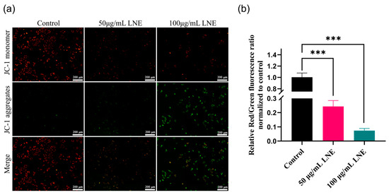 Effect of LNE on mitochondrial membrane potential (ΔΨm) in MDA-MB-231 cells. (a) JC-1 staining images of MDA-MB-231 cells treated with LNE (50 and 100 μg/mL, 48 h), showing a concentration-dependent shift from red fluorescence (JC-1 aggregates, normal ΔΨm) to green fluorescence (JC-1 monomers, depolarized ΔΨm), indicating mitochondrial depolarization; (b) quantitative analysis of the red/green fluorescence intensity ratio. LNE treatment significantly reduced mitochondrial membrane potential, suggesting early-stage apoptosis induction. Data are presented as the mean ± SD (n = 3). *** p < 0.01 vs. control.