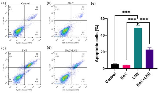 NAC pre-treatment effectively abrogates LNE-induced ROS accumulation. MDA-MB-231 cells were pre-treated with or without 5 mM N-acetylcysteine (NAC) for 2 h, followed by treatment with LNE (50 μg/mL) for 48 h. Intracellular ROS levels were measured using the DCFH-DA probe followed by flow cytometry. (a–d) Representative histograms showing the fluorescence intensity of DCF in (a) control, (b) NAC alone, (c) LNE alone, and (d) NAC+LNE groups. The gate (+) indicates the percentage of ROS-positive cells. (e) Quantification of the percentage of ROS-positive cells. Data are presented as the mean ± SD from three independent experiments. *** p < 0.001.