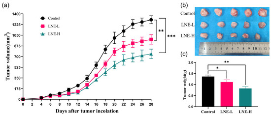Six-week-old female BALB/c mice purchased from Vital River Laboratories were conventionally raised in the SPF-grade barrier environment of the Animal Experiment Center of Jianghan University. They had free access to water and food at 24 ± 1 °C and a relative humidity of 55 ± 5%. The 4T1 breast cancer cells in the logarithmic growth phase were treated with 0.25% trypsin to form a cell suspension, centrifuged at a low speed at room temperature, the cells resuspended with pre-cooled PBS and counted, and the cell density adjusted to 2 × 105 cells/mL. A sterile syringe was used to inoculate 50 μL of the above cell suspension into the fourth mammary fat pad on the left side of the subcutaneous region of each mouse. Three days after the 4T1 cell inoculation, the tumor formation in the mice was observed to confirm the successful transplantation of breast cancer cells. Qualified breast cancer model mice were randomly divided into 3 groups with 5 mice in each group: (1) the vehicle (normal saline) treatment control group (control), (2) the 100 mg/kg body weight (BW)/day LNE treatment group (LNE-L), and (3) the 300 mg/kg body weight (BW)/day LNE treatment group (LNE-H). The sample size of five mice per group was determined based on established practices in similar preclinical oncology studies and in accordance with the 3Rs principles for animal welfare, providing sufficient statistical power to detect significant treatment effects. LNE was freshly dissolved in normal saline every day and administered via gavage for 25 consecutive days at a dose of 100 or 300 mg/kg BW/day. The required dose of LNE was administered daily via oral gavage in a volume of 10 mL/kg body weight. On the 28th day after tumor inoculation, the mice were sacrificed by the CO2 method. After depilation of the tumor-bearing site of the mice, photos were taken, and then the mice were dissected to remove the tumors for weighing and photographing the tumor tissues. The tumor volume was calculated according to the following equation: (width) × (length)2/2. The lungs and liver of the mice were removed, and the number of tumor metastasis foci was recorded. Subsequently, part of the tumor tissues, liver tissues, and lung tissues were cut and fixed with 4% paraformaldehyde tissue fixing solution for subsequent H&E staining and ki67 immunohistochemical detection. The remaining tissue samples were rapidly frozen in liquid nitrogen and stored at −80 °C.