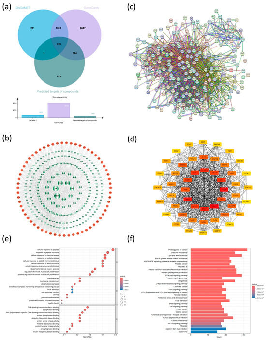 According to the above serum pharmacochemistry experiment, 65 serum prototype components could be identified after the LNE extract, and these components were used to construct the basis of potential effective components for network pharmacology. The online database swisstargetprediction (http://swisstargetprediction.ch, accessed on 4 June 2025) was used to obtain the potential target genes of the former. Then, “breast cancer” was used as a keyword to obtain the disease-related gene sets from the Disgenet database (https://www.disgenet.org, accessed on 4 June 2025) and the Genecards database (https://www.genecards.org, accessed on 4 June 2025). We linked the breast cancer-related genes with the potential target genes of LNE to obtain the intersections between them. These intersections were defined as the potential targets of LNE for treating breast cancer.