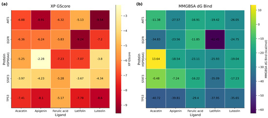 The crystal structures of target proteins were obtained from the RCSB PDB database: EGFR (PDB ID: 8A27), TP53 (PDB ID: 6GGC Chain A), STAT3 (PDB ID: 6NJS) HSP90AA1 (PDB ID: 5J2X) and AKT1 (PDB ID: 4GV1). These structures were selected based on criteria including high resolution, human origin, and the presence of a co-crystallized ligand to define the binding pocket. The obtained protein crystals were processed using the Protein Preparation Wizard module of Schrödinger’s computational platform, including protein preprocessing, regenerating states of native ligand, H-bond assignment optimization, protein energy minimization, and removing waters. First, the SiteMap module in Schrödinger’s computational platform was used to predict the optimal binding site, and then the Receptor Grid Generation module in Schrödinger’s computational platform was used to set the most appropriate Enclosing box to perfectly enclose the predicted binding site, and on this basis, the active sites of the five proteins were obtained. The five processed ligand compounds were, respectively, docked with the active sites of the five proteins. The lower the score, the lower the binding free energy of the compound to the protein, and the higher the binding stability. To validate the docking protocol, the co-crystallized ligand of EGFR was extracted and re-docked into the protein’s binding site using the same parameters. The accuracy of the protocol was confirmed by a low root mean square deviation (RMSD) of 0.134 Å between the docked pose and the original crystallographic pose, which is well below the 2.0 Å threshold for a successful validation.