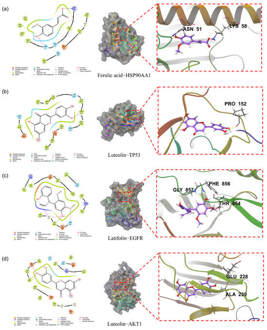 Molecular docking models of key compounds binding to breast cancer targets. (a) Ferulic acid bound to HSP90AA1 (PDB ID: 5J2X); (b) luteolin bound to TP53 (PDB ID: 6GGC Chain A); (c) latifolin bound to EGFR (PDB ID: 8A27); (d) luteolin bound to AKT1 (PDB ID: 4GV1). Hydrogen bonds, salt bridges, and hydrophobic interactions stabilized the ligand–protein complexes, providing structural evidence for the bioactivity of LNE components.